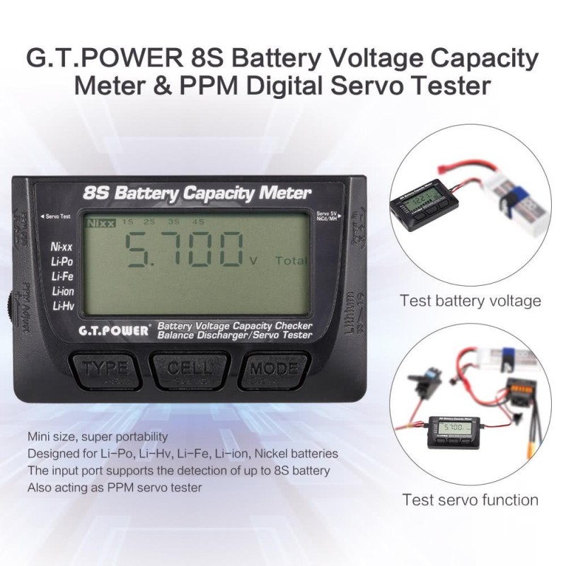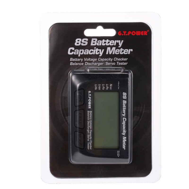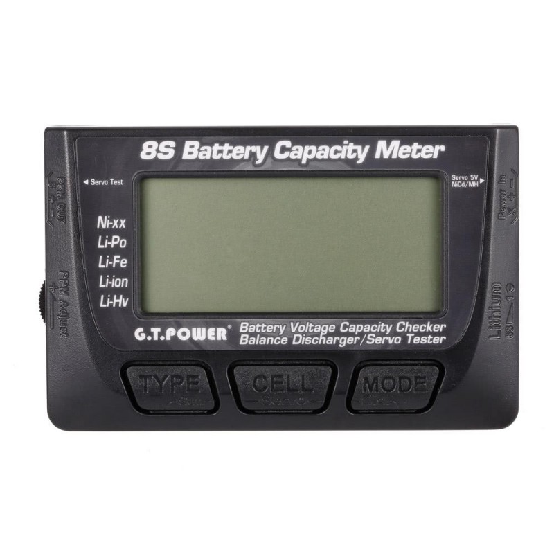 Eccellente e preciso monitor della batteria con display LCD, segnale acustico, selezione del tipo di batteria, indicatore della capacità residua e indicatore della differenza di tensione tra le celle. Inoltre, consente il test dei servocomandi.
