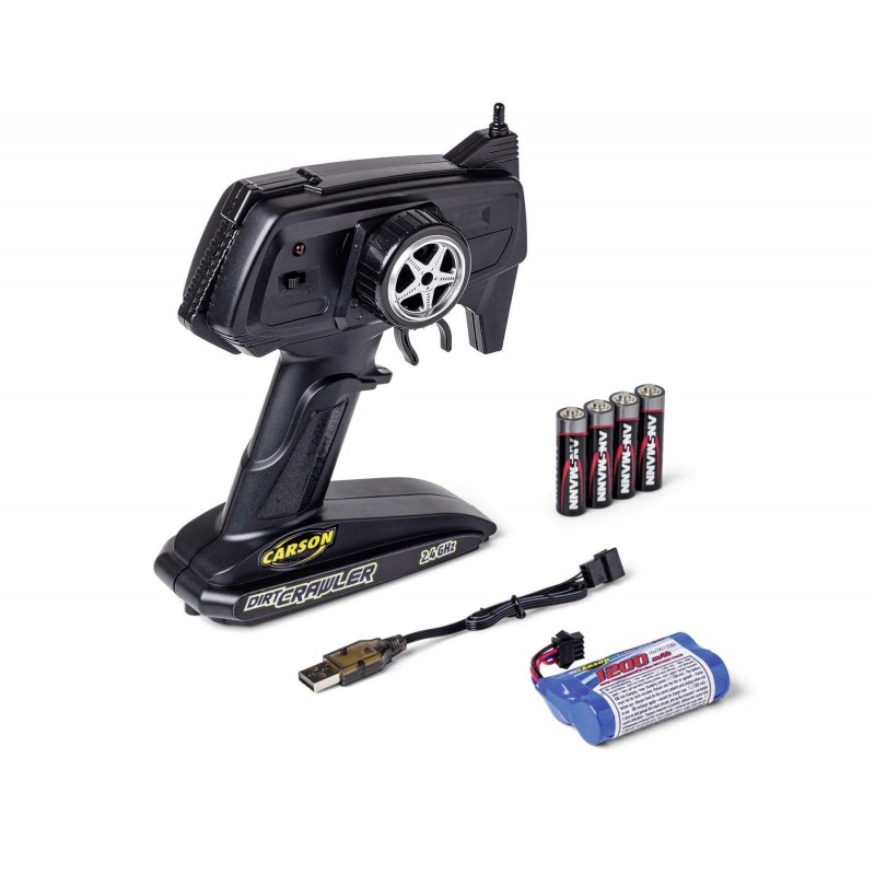 Attraverso fango e terra! I sogni fuoristrada diventano realtà con il Dirt Crawler! Grazie alla trazione integrale, alle sospensioni complete e agli assi delle ruote estremamente regolabili, il crawler supera quasi tutti gli ostacoli e diventa un vero tuttofare fuoristrada. Grazie all'illuminazione a LED sulla parte anteriore, il divertimento è garantito anche nelle ore serali! Dopo 4 ore la batteria è completamente carica. Il tempo di percorrenza è di ben 25 minuti senza ricarica. Oltre al telecomando da 2,4 GHz, il set include anche una batteria agli ioni di litio da 7,4 V/1200 mAh, 4 batterie del trasmettitore LR06/AA e istruzioni dettagliate. Il veicolo è completamente assemblato e può essere avviato immediatamente dopo averlo disimballato e ricaricato! Imballa, disimballa e vai!